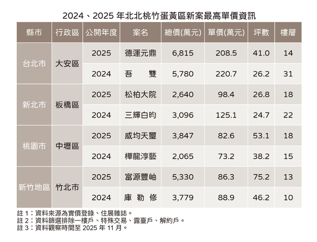 房市注重宜居與保值特性,進而產生所謂的地段蛋黃區,讓這類區域房價始終居高不下,住展雜誌彙整比較實價揭露北台灣台北市、新北市、桃園市、新竹地區蛋黃行政區大安區、板橋區、中壢區、竹北市這兩年公開推案的最高單價,今年分別以「德運元鼎」、「松柏大院」、「威均天璽」、「富源豐岫」為首,單價各為208.5萬元、98.4萬元、82.6萬元、86.3萬元,相較前一年為「吾雙」、「三輝白昀」、「樺龍淳藝」、「庫勒修」的220.7萬元、125.1萬元、73.2萬元、88.9萬元,其中僅桃園市中壢區比起去年為高。