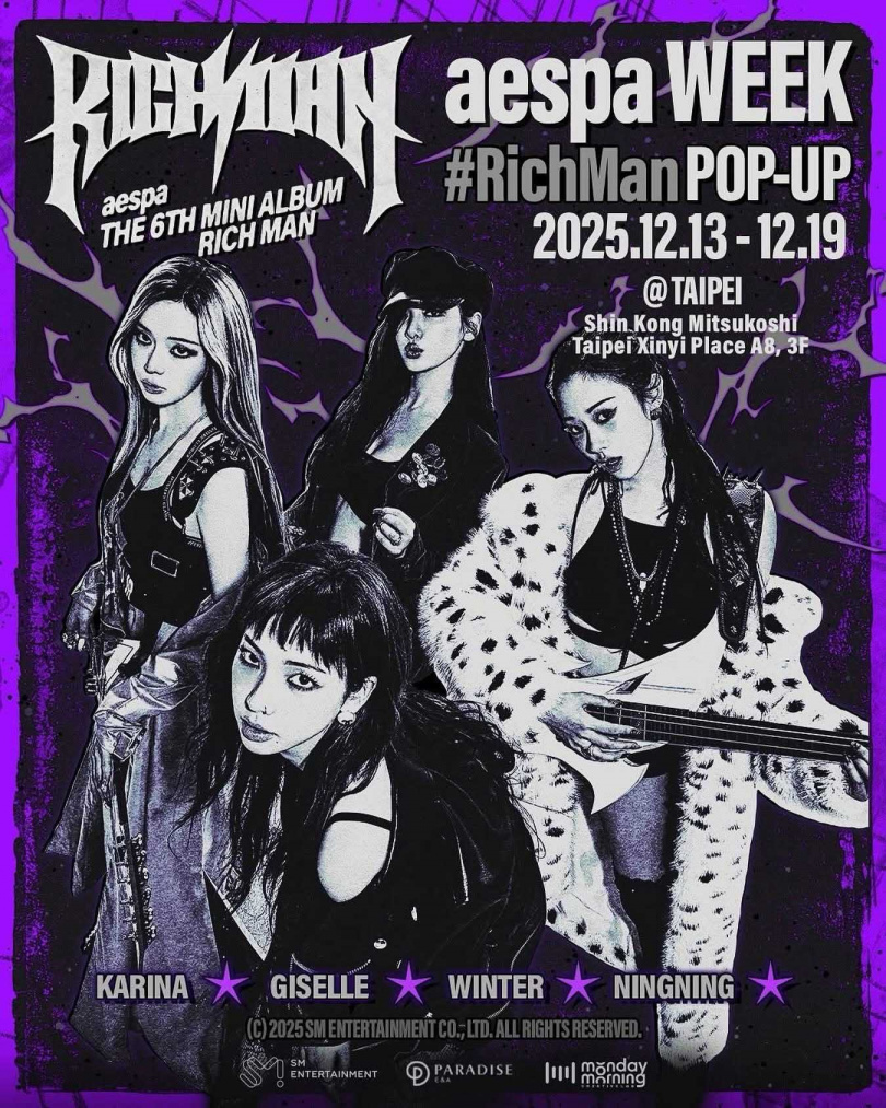 韓國女團aespa以專輯名稱推出主題快閃店《aespa WEEK #RichMan POP-UP STORE》,將於12月13日-12/19日登陸台北。心繫台粉的aespa,在開展倒數兩周特別跨海遞出「邀請函」,以獻聲錄製影片方式號召歌迷「那我們在快閃店見吧,再見!」