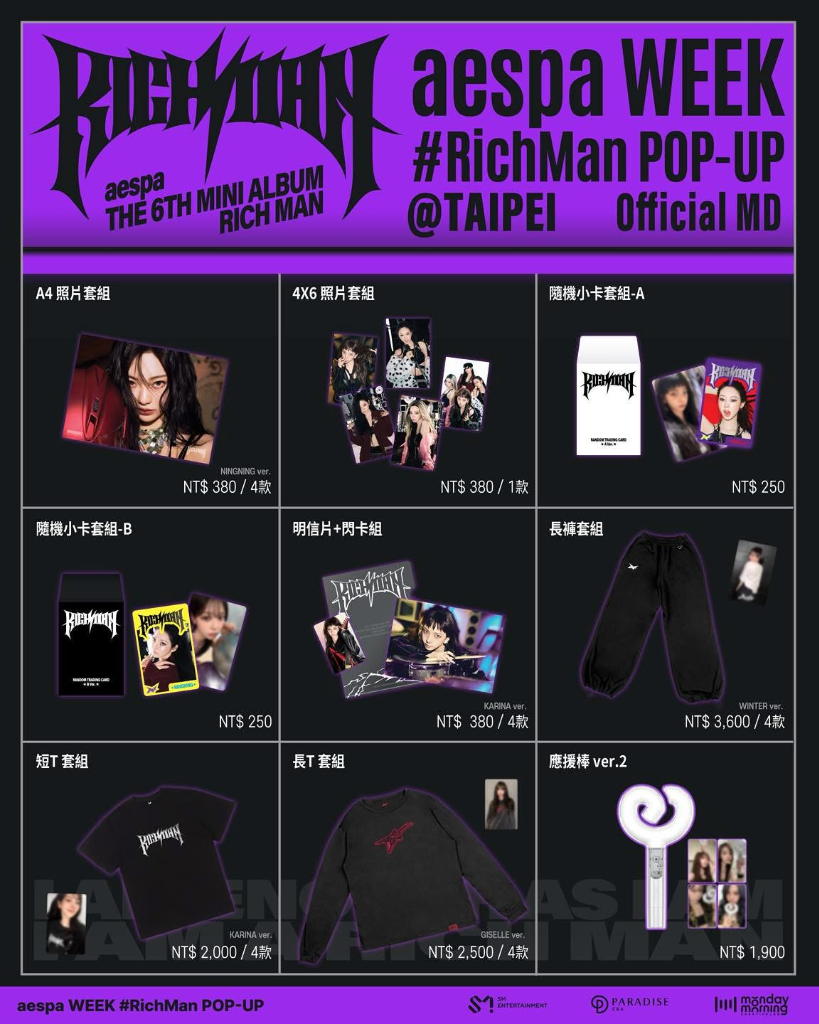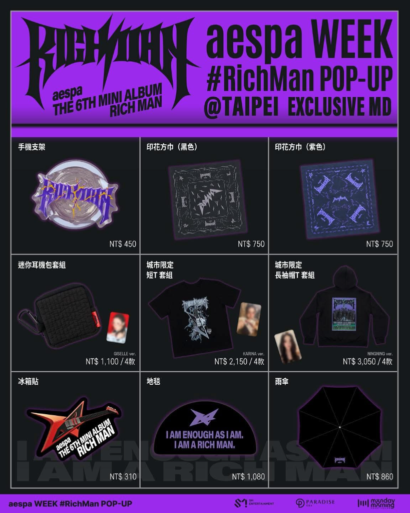 aespa WEEK #RichMan POP-UP STORE 將於 12/13~12/19 正式登場。周邊熱銷強勁,主辦單位也宣布已成功追加補貨,確保更多粉絲能入手心儀商品。活動期間將開放現場排隊入場,已預約者享有優先權;並設置專屬櫃位供預購粉絲直接取貨,提供更順暢的逛店體驗。