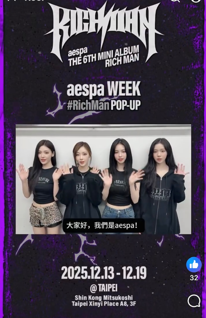 韓國超人氣女團 aespa 為慶祝出道五周年,首度將主題快閃店 「aespa WEEK #RichMan POP-UP STORE」 帶到台北,並特別跨海獻聲向台灣粉絲發送「邀請函」,提前點燃年末話題。