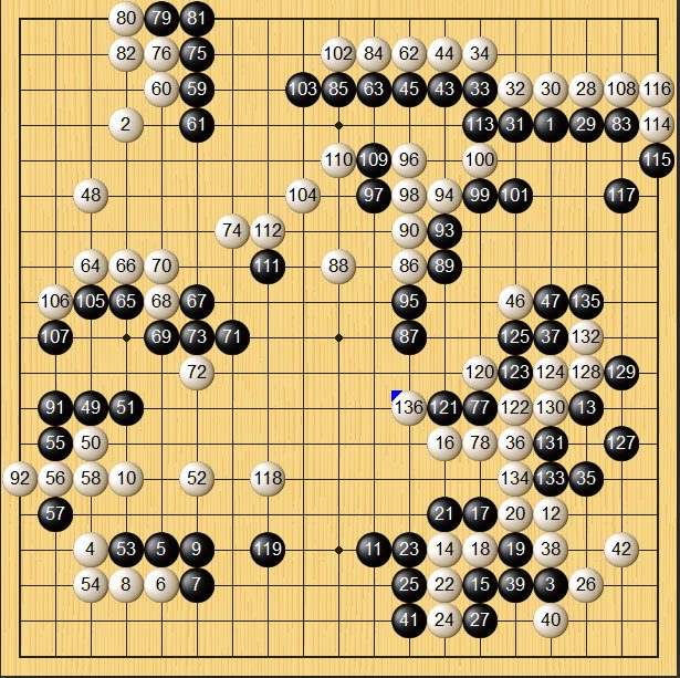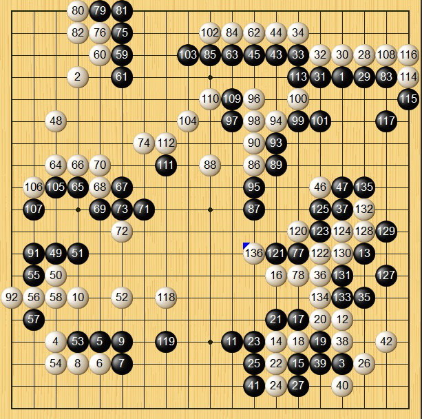 直到白棋136手,黑棋見大勢已去棄投降!(白棋中押勝)