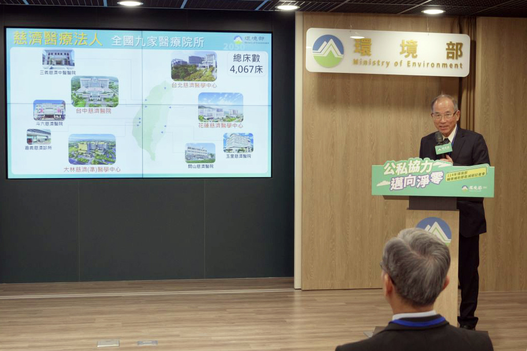 因應全球淨零排放趨勢與國內節能轉型需求,環境部近年積極推動大型節能專案,期待透過政策引導與跨部門合作,引導各界全面導入智慧化能源管理與設備汰換,達到國家淨零目標。12月4日,辦理「114年環境部輔導補助節能減碳記者會」,邀集專案執行單位及具指標性企業共同參與。慈濟醫療法人林俊龍執行長受邀出席,與東元電機股份有限公司簽署合作備忘錄,未來將以淨零減碳為目標,進行長期合作;台北慈濟醫院工務室楊明崇主任則代表說明醫院在節能永續方面的作為。