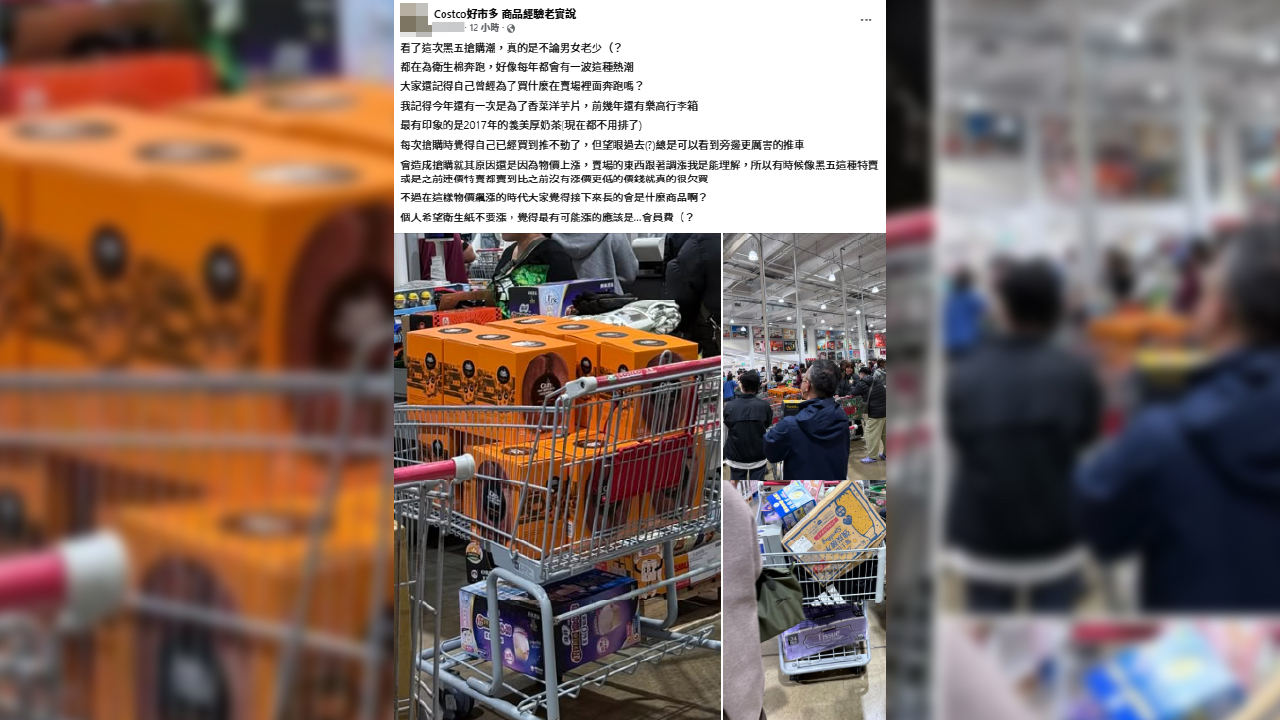 美式賣場好市多(Costco)年度盛事「黑色購物節」剛落幕,網路上討論熱度依舊不減。近日有網友在臉書社團「Costco好市多 商品經驗老實說」發文,指出今年黑五不論男女老少似乎都在「為衛生棉奔跑」,這股熱潮讓他不禁回想起過去幾年在賣場狂奔的歲月,引發數千名網友共鳴,紛紛曬出自己的「搶購戰績」。