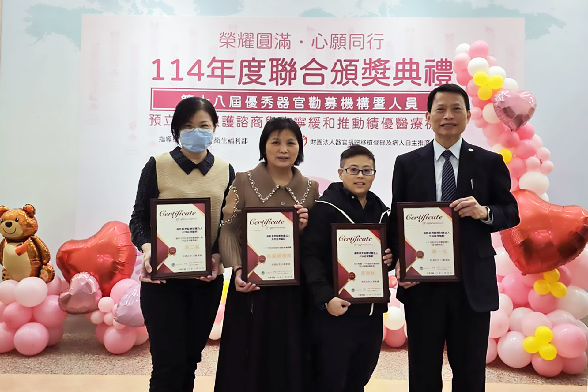 面對台灣高齡化加速、生命末期醫療需求日益增加,大林慈濟醫院秉持「尊重生命、以人為本」的理念,積極響應衛生福利部政策,全面推動器官捐贈、安寧緩和醫療與預立醫療照護諮商(ACP)。在114年度聯合頒獎典禮上,獲得包括「器官捐贈意願註記南區區域醫院第二名」、「114年度器官捐贈宣導月響應區域醫院第一名」、「安寧緩和推動機構推廣績優獎」及「預立醫療照護諮商推廣獎勵機構」四項殊榮,展現醫院在生命照護領域的深耕成果。