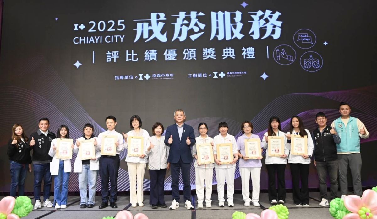 頒獎典禮頒發「 二代戒菸服務卓越獎」,得獎單位醫院組有嘉義基督教醫院、陽明醫院、臺中榮民總醫院嘉義分院、天主教聖馬爾定醫院、衛生福利部嘉義醫院;診所組有張耿源診所、佑仁診所、吳長宗診所、安家診所、全安診所、慎諭婦產科診所;藥局組是晟安藥局、照子社區藥局獲獎。「戒菸衛教績優獎」得獎單位,醫院組嘉義基督教醫院,診所組佑仁診所,藥局組晟安藥局;「戒菸成功績優獎」得獎單位,醫院組陽明醫院,診所組佑仁診所,藥局組早晨藥局;依轉介戒菸專線並實際接受服務評比頒發「戒菸專線成功獎」,得獎單位為陽明醫院及陳明煌診所;戒菸服務進步得獎單位臺中榮民總醫院嘉義分院及張耿源診所;今年亦有 3 家新加入戒菸服務之機構獲表揚;「 無菸醫院醫事人員戒菸績優服務王」有9人獲獎,感謝專業醫護攜手守護市民健康,健康有您再 +1。