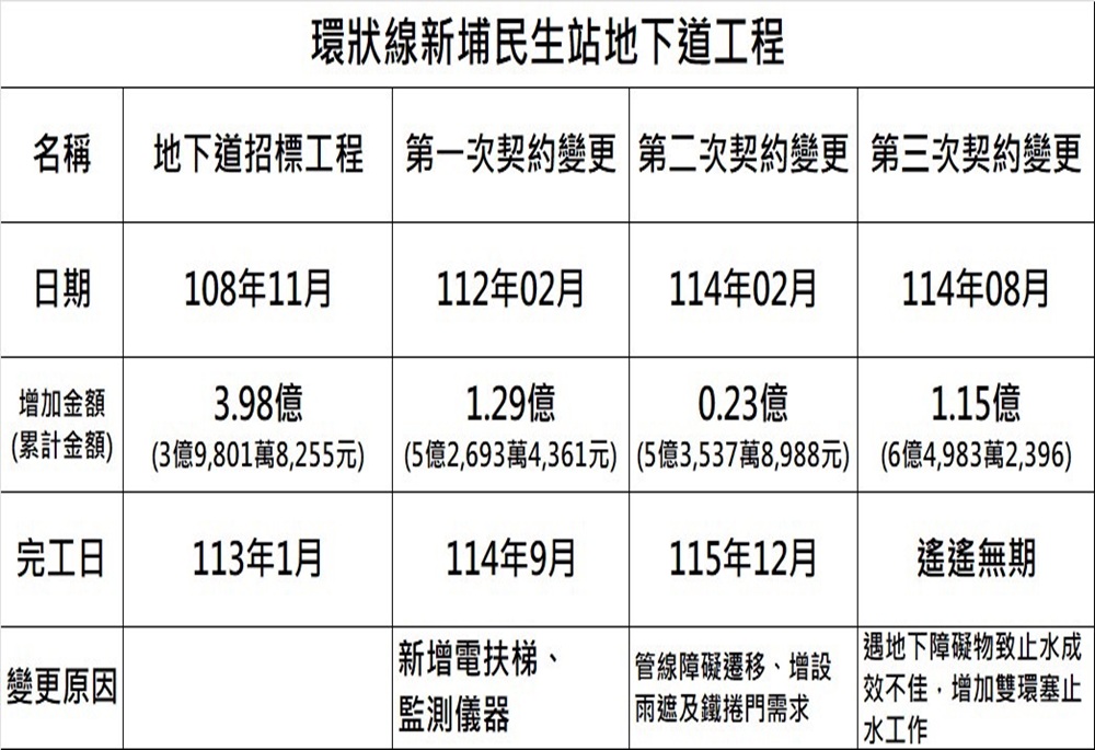 新北捷運環狀線位於板橋的新埔民生站周邊為人車流量大區域,新北市府考量行人安全,原於109年動工興建跨越民生路的地下道。工程歷經5年仍未完工,總金額更從原定3.98億元追加至6.49億元。新北市議員石一佑今(5)日召開記者會,痛批此爛尾工程廠商早已落跑,質疑新北市府監督失能,並要求研議「還路於民」。新北捷運局則回應已於4日終止契約,並將追究廠商責任。