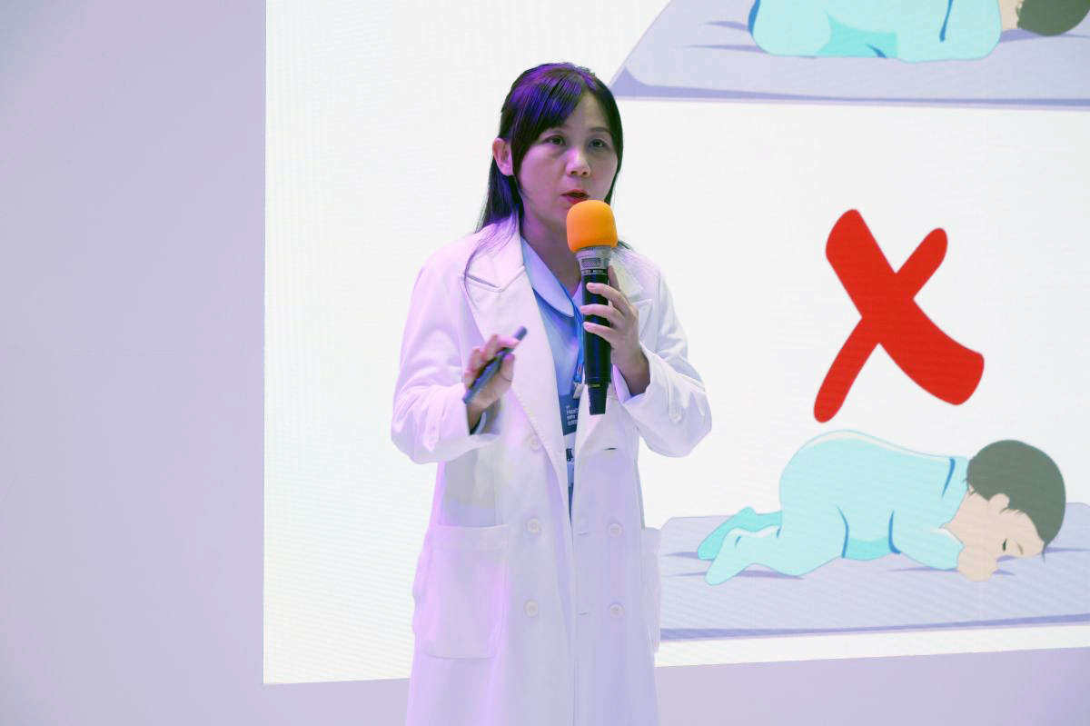 趙露露主任在講座中說明,台灣新生兒出生率逐年下降,但新生兒死亡率卻高於日、韓等國。排除染色體異常及早產,多數意外源自照護經驗不足或一時疏忽。她以常見窒息案例為例,提醒家長避免讓嬰兒在睡覺時佩戴項鍊、平安符或奶嘴鏈等物品,以免翻身時纏繞而造成危險。根據統計,窒息、燒燙傷、溺水與交通事故皆為嬰幼兒常見意外類型。她強調:「事故傷害多可預防,家長只需多一分警覺,便能減少風險。」此外,她也提到台北慈濟醫院是新北市第一家通過「發展性髖關節不良(DDH)」認證的醫院。DDH不僅與先天結構有關,後天抱姿與包巾方式也影響髖關節發育。她提醒家長勿過度將嬰兒雙腳固定或拉直,並盡量維持自然的「M 字腿」姿勢,有助於寶寶健康成長。