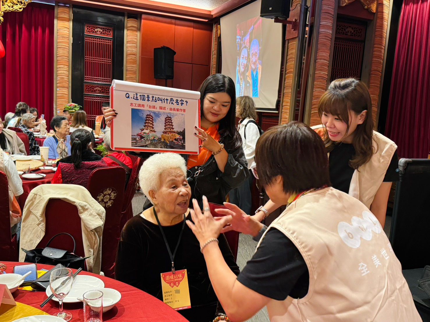 ↑圖說:全美志工和長輩玩「台語闖關」,「不輪轉」的台語讓過程中歡笑聲不斷!(圖片來源:弘道老人福利基金會提供)