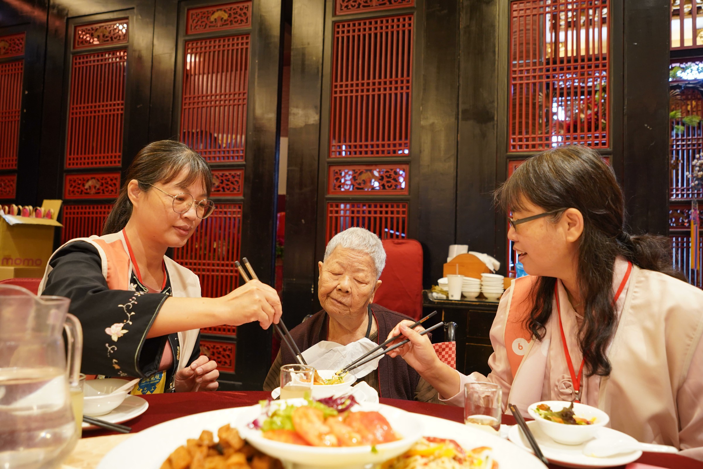86歲的林阿嬤,是弘道長期關懷的獨居長者。從小失怙、國小尚未畢業就到人家當幫傭,「一家人圍坐吃飯」曾是她遙不可及的夢;近年接連兩度中風,雙手顫抖、雙腳無力,日常生活得依賴社工、志工與鄰里幫忙。這次坐上熱鬧餐桌,全美志工貼心為她夾菜、舀湯、切食物,讓她難得感受久違的團圓氣氛。