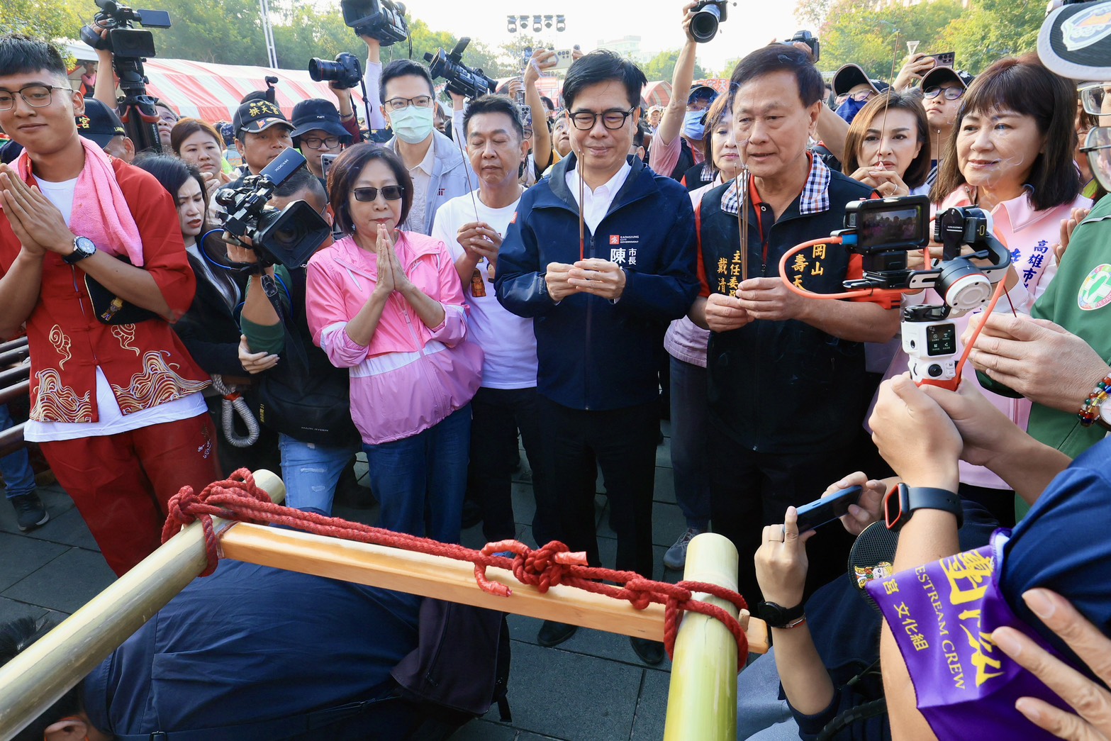 ↑圖說:陳其邁香祈福並親自點燃起馬炮、扶轎起駕,恭迎聖駕巡安,祈願國泰民安、風調雨順。(圖片來源:高雄市政府提供)