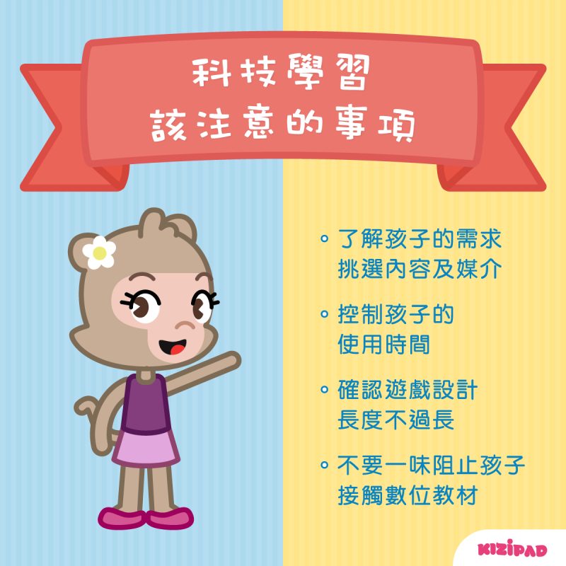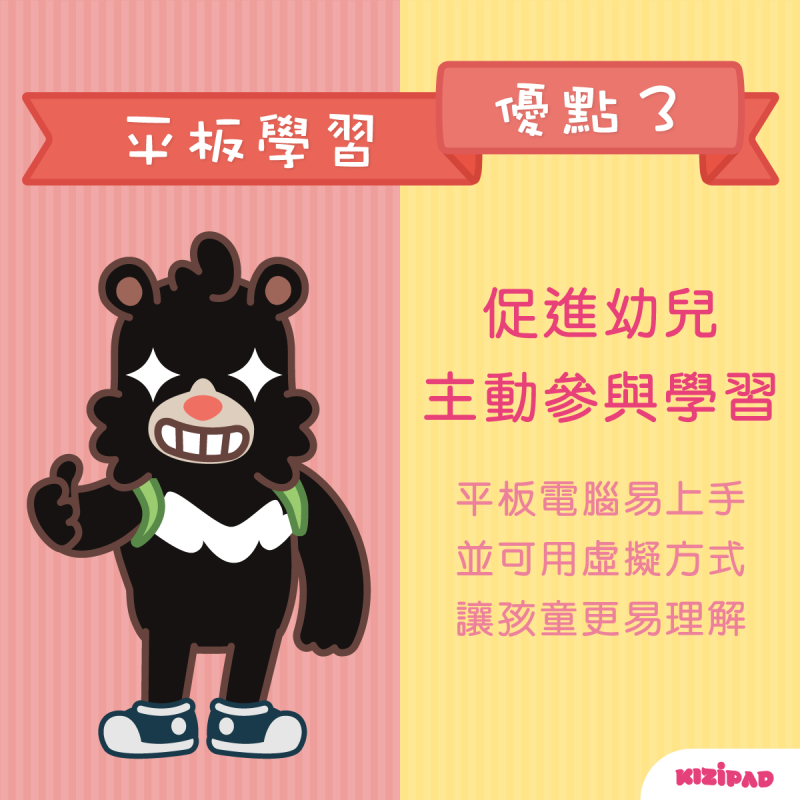 作為孩子的學習指標,大人們應懂得為幼兒選擇最適合和健康的幼兒教材,至於如何選擇將是重要的關鍵。許多研究者探索各種類型的應用程序對於幼兒學習成效,並發現平板學習對幼兒是有正向的影響。不過,每個學習都應該取決於孩子的需求,大人應該去觀察孩子的需求、選擇最適合孩子的媒介及內容,而非單方面的限制孩子使用平板,反而剝奪了孩子學習的機會。另一方面,有些家長擔心幼兒使用平板電腦會造成健康上影響,這也是 Kizipad 認真關注的問題。像是設計避免讓孩子玩太久的時間控制機制,或是提醒孩子要定期休息眼睛;設計遊戲者也應避免遊戲太過冗長,讓孩子過於沉迷,喪失了其他非平板的學習機會喔~