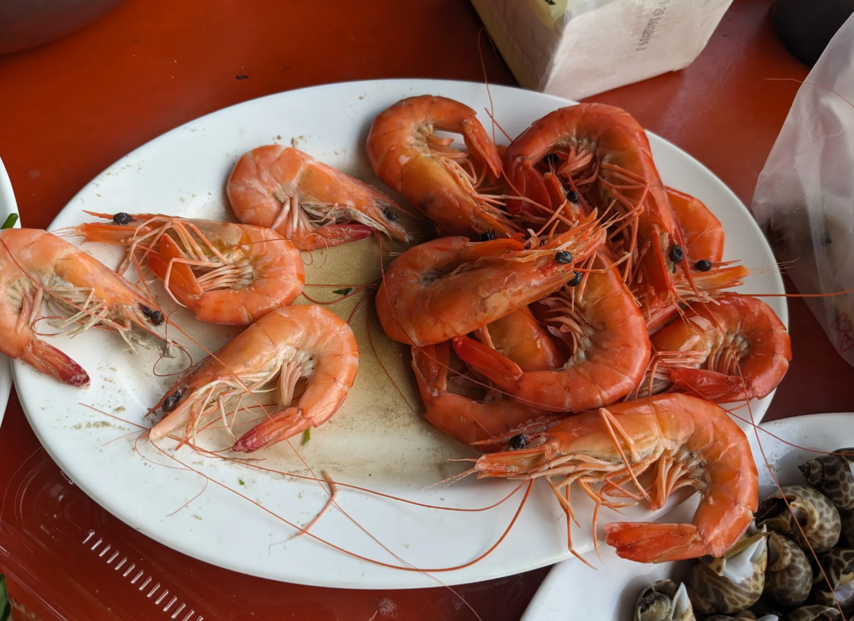 網友在Threads發文指出,跟家人去東港漁市,左邊買完食材去右邊的代客料理,買了一斤400的斑節蝦,吃到一半發現不對勁,裡面竟然混好幾隻小隻的一般白蝦,並po出照片,全部大概有八九隻都是一般小隻白蝦)