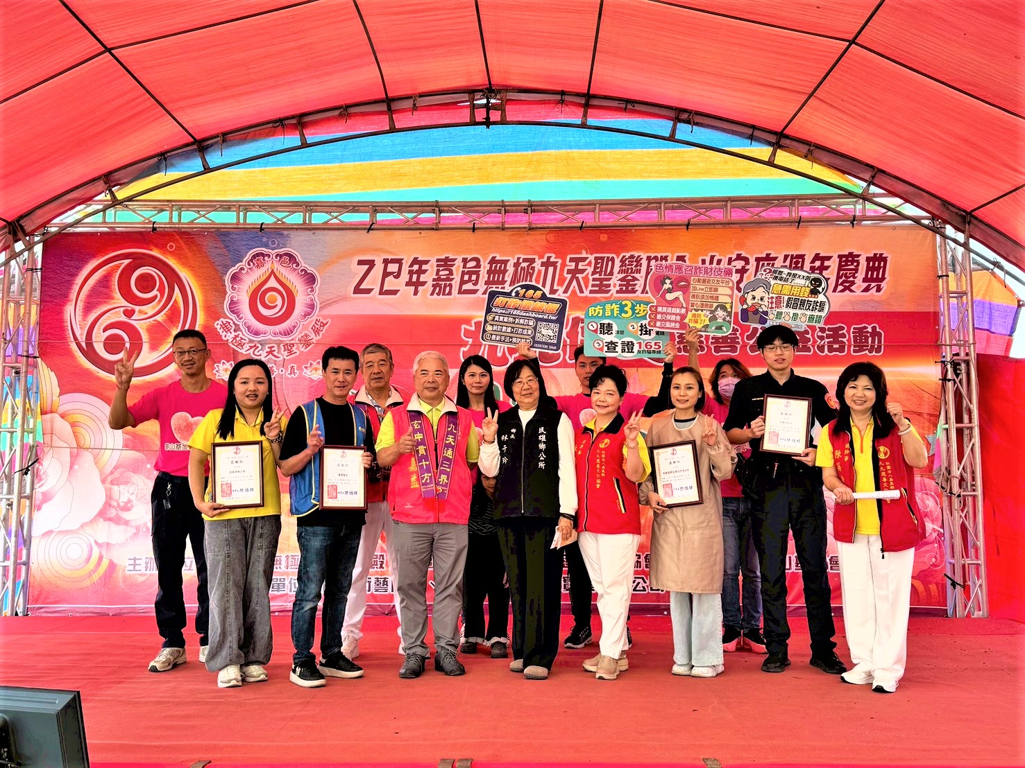 到場貴賓雲集,嘉義縣社會局張翠瑤局長、民雄鄉林于玲鄉長、嘉義縣議會陳文忠議員、黃啟豪議員、財團法人嘉邑鎮天宮曾漢洲董事長等貴賓均出席參與,活動在莊嚴隆重的入火安座週年慶團拜典禮後開始,由極品人妻舞蹈團帶來精彩舞蹈,並帶領現場長輩齊跳律動健康操,現場並有嘉義縣衛生局長照宣導攤、民興派出所防詐騙宣導攤、中華健康促進及照護協會護甲攤位、曼都髮型義剪攤位等,在敬老同歡公益活動中九天聖鑾殿收淨,為阿公阿嬤溫馨結緣,現場在阿家街藝演唱中溫馨渡過。
