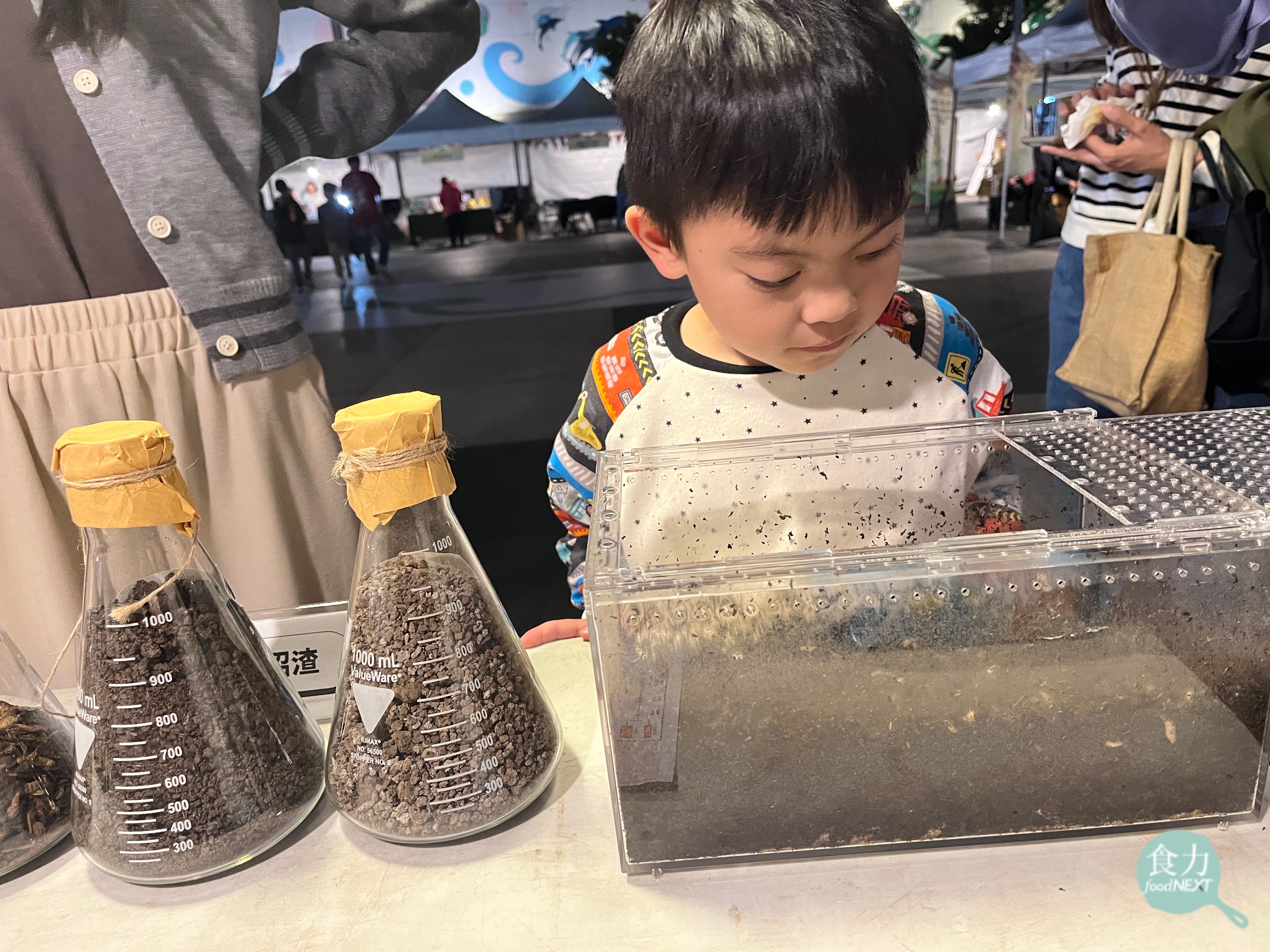 黑水虻幼蟲養殖吸引小朋友駐足觀察。(余麗姿攝)