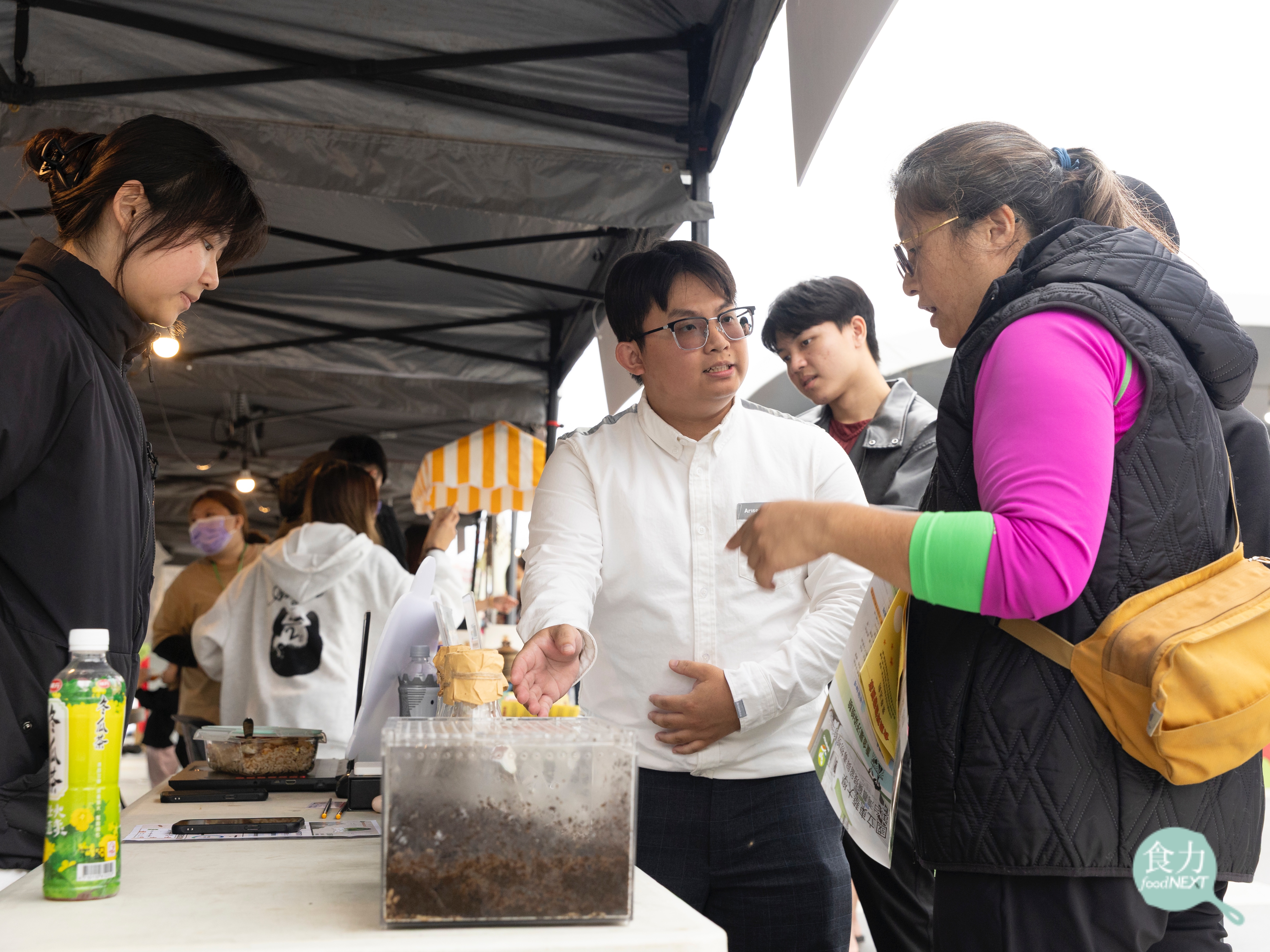 慈濟大學經濟管理系學生簡翊丞(圖中)與簡翊婷(圖左),兄妹二人向民眾解說黑水虻的應用。(段歆惟攝)