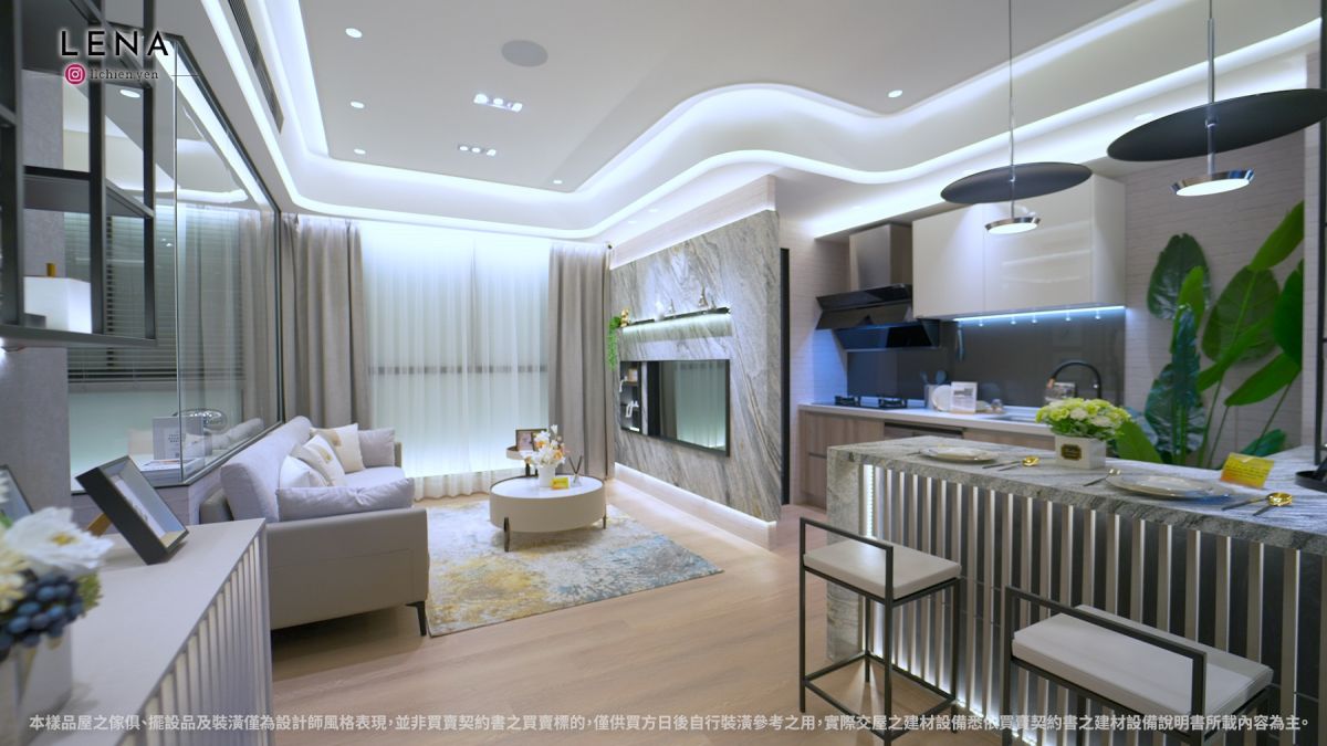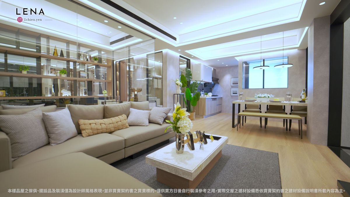 產品規劃上,小坪數戶型強調坪效與收納,像22.75坪的兩房兩衛,採 SHARP 三合一電子鎖、開放式廚房搭配櫻花整體廚具與近吸式抽油煙機、SVAGO 洗碗機,全室使用 SPC 石塑地板,公私領域明確分開。四房更是每層僅兩戶,能做到雙主臥、雙面採光,並配置全棟 BWT 淨水與廚下型淨水器,大主臥可規劃飯店式雙排櫃動線,成為換屋客群關注亮點。