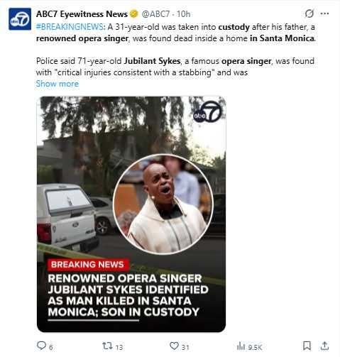 美國知名葛萊美獎提名男高音歌手朱比蘭特.賽克斯(Jubilant Sykes)於12月8日晚間在加州聖塔莫尼卡的自宅內遭刺殺身亡,享壽71歲。涉嫌犯案者為其31歲的兒子米卡.賽克斯(Micah Sykes),目前已被警方拘捕。