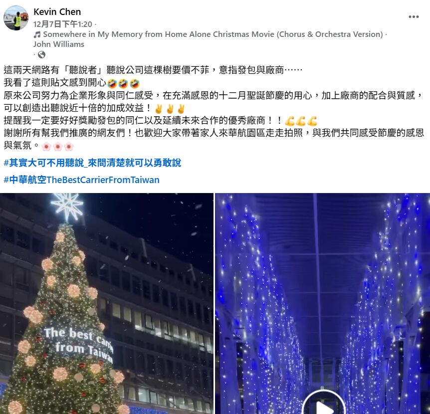 針對外傳華航聖誕樹要價不菲,陳漢銘疑似也聽到公司內部謠傳,陳日前特別在臉書po出聖誕樹影片照片並發文表示,原來公司努力為企業形象與同仁感受,在充滿感恩的12月聖誕節慶的用心,「加上廠商的配合與質感,可以創造出聽說近十倍的加成效益!」