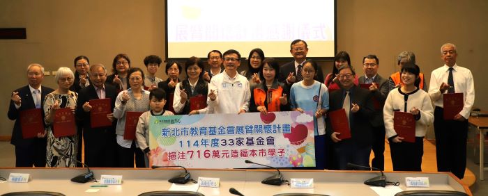 【民眾新聞葉柏成新北報導】新北市教育局今(11)日舉辦「教育基金會展臂關懷計畫感謝儀式」,感謝今年共有33家教育基金會投入教育公益,捐助「新北市溫馨助學圓夢基金」及多項教育計畫,年度總金額達716萬元。
