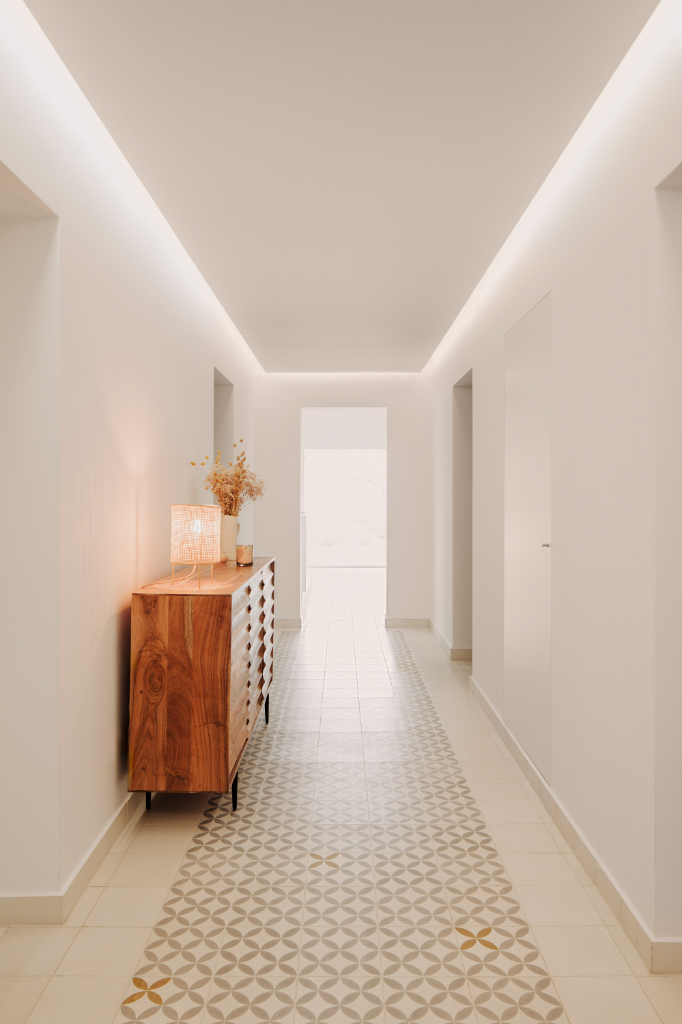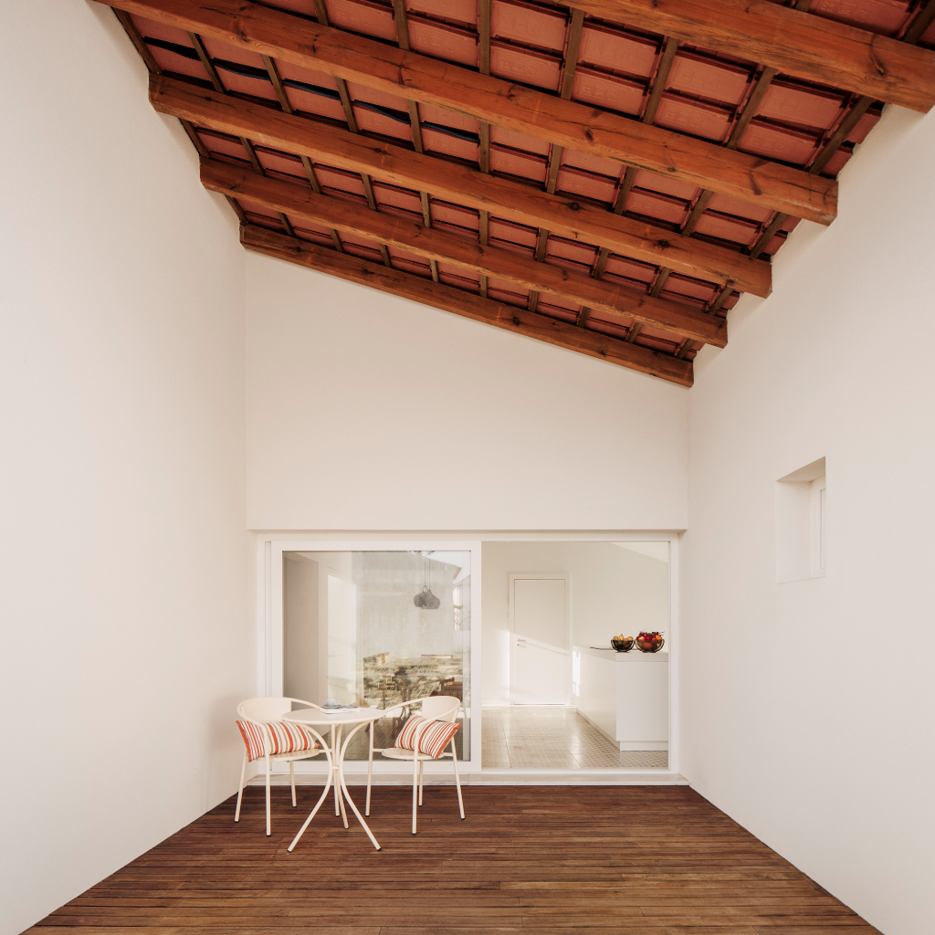 設計師透過減法設計,成功改善了許多原先的環境劣勢,並增強了環境的優勢。走進室內,空間延續了建築外觀的色調著手設計,主要使用白色和大地色系,並在各區地坪中央鋪設花磚,使整體空間顯得層次豐富。各空間依照其使用需求,刻意打造高低不一的天花板,藉此堆砌出該區的獨特氛圍。