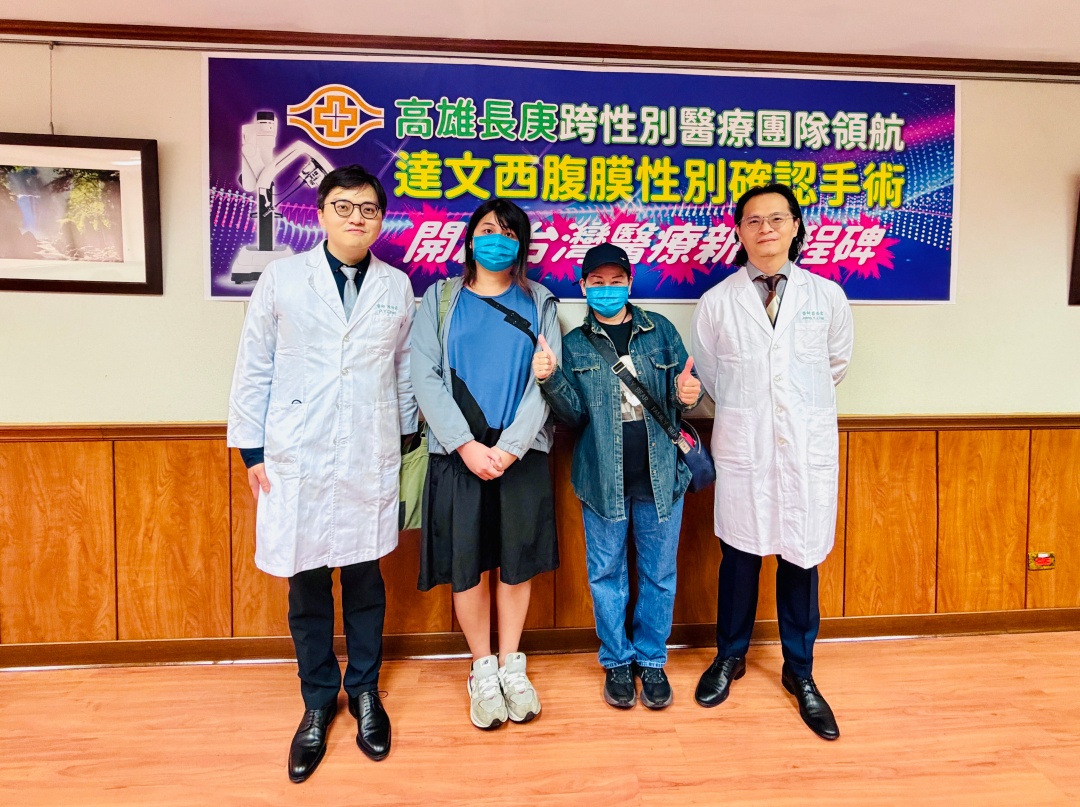 圖說:Y小姐(左2)在媽媽(右2)陪同下,感謝高雄長庚泌尿科醫師陳柏諺(左)及整形外科醫師蔡岳儒助其圓夢變性。圖片來源/高雄長庚提供