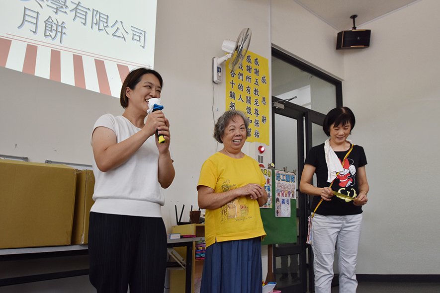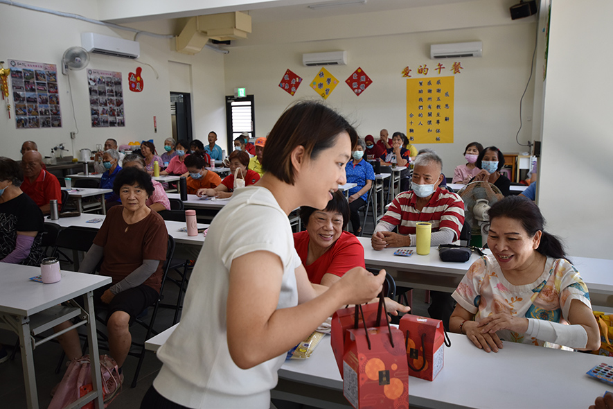 ▲八寶團隊成員向長輩介紹節慶禮盒設計理念,牆上「愛的午餐」字樣見證此空間長期對社區的關懷,而八寶的加入,更為這份愛注入新的能量。