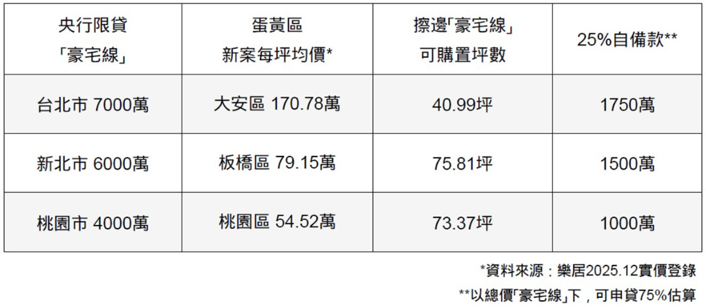 央行限貸令使高總價不動產市場明顯降溫,今年1~10月台北市總價逾7千萬豪宅不僅交易量「腰斬」,平均權狀面積也年減10.5坪。依照目前央行設定的「豪宅線」,台北市總價7000萬以上、新北市6000萬以上,房屋貸款僅限三成,若不想跨越「豪宅線」,以台北市蛋黃區大安區為例,目前區域內新案均價為170.78萬/坪,換算可購置坪數約為40.99坪,若加上車位,坪數還必須向下修正。