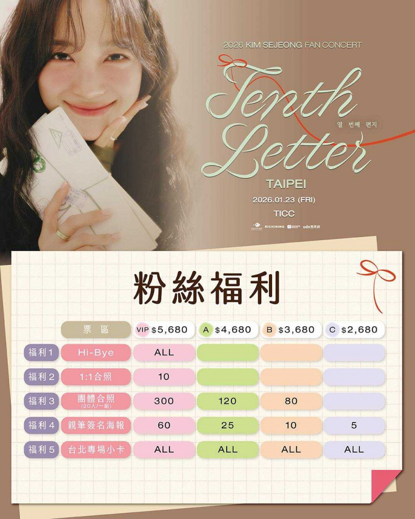 《2026 KIM SEJEONG FAN CONCERT〈Tenth Letter〉》台北站將於2026年1月23日(五)晚間19:00在TICC台北國際會議中心舉行,票價為VIP區5,680元、A區4,680元、B區3,680元、C區2,680元、身障席2,840元,全場採對號入座,門票將於本週六(13日)中午12點於UDN售票網開賣。購票福利包含Hi-Bye、1:1合照、20人團體合照、親筆簽名海報與台北限定小卡。更多詳情請鎖定RICHINING官方社群專頁。
