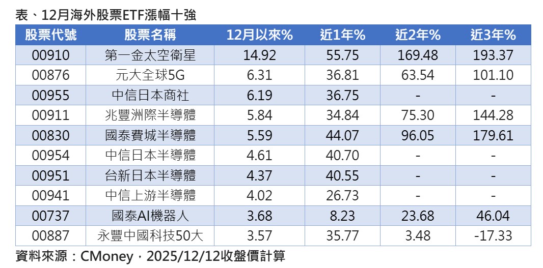 統計12月以來,多檔海外股票ETF強勢上揚,前5名表現均逾5%,特別是第一金太空衛星,上漲逼近15%,累計近1年、2年、3年漲幅分別達55.75%、169.48%、193.37%,大幅超越其他檔海外ETF。