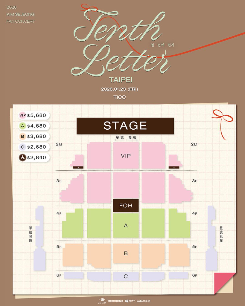 - 票價(NTD):VIP區$5,680/ A區$4,680 / B區$3,680 / C區$2,680 / 身障席$2,840;全場對號坐席