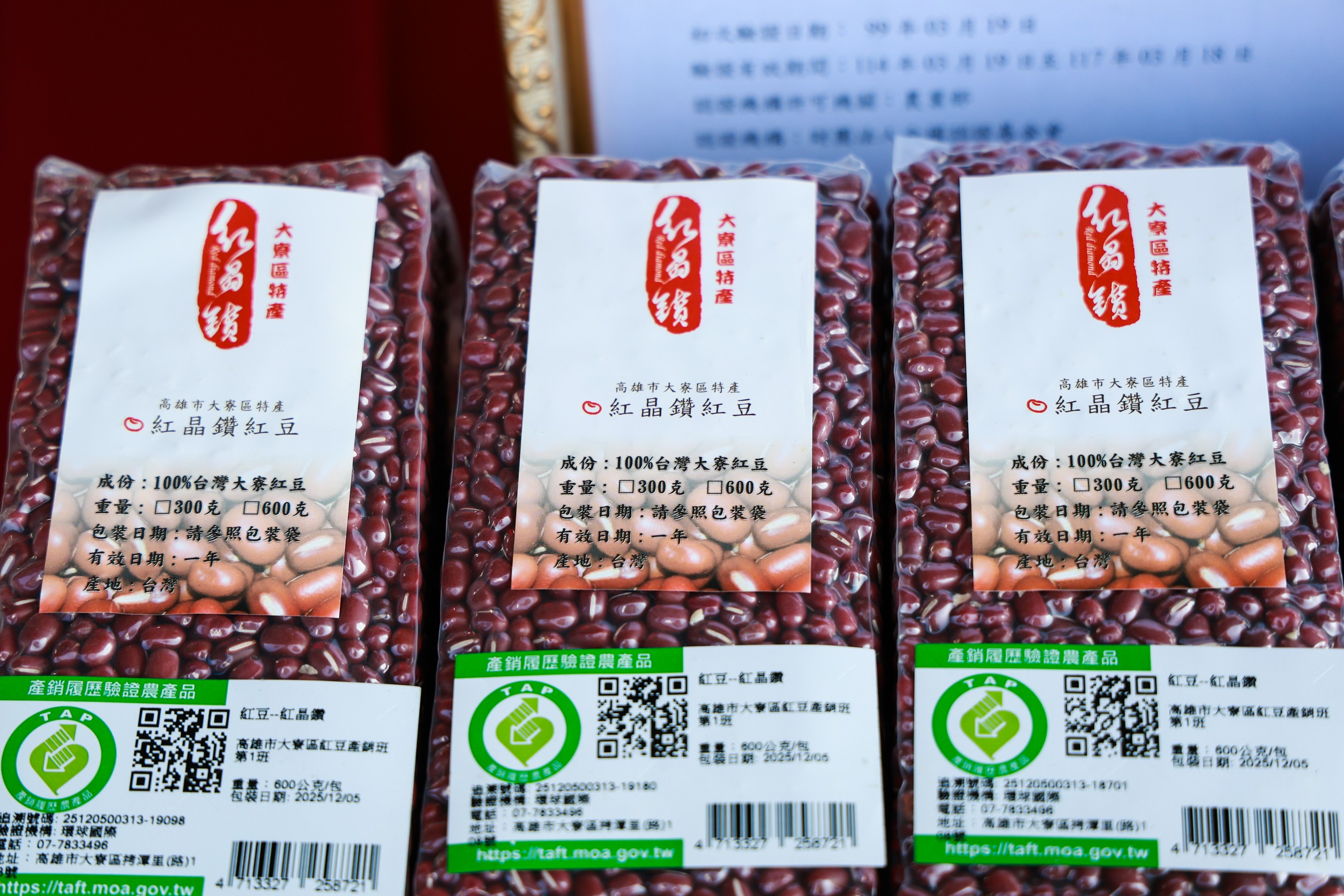 陳其邁指出,大寮紅豆不僅適合製作冰品、紅豆餅等各式甜點,過去更常作為伴手禮致贈總統府、行政院及中央各部會,成功為高雄農產打開知名度。今年活動進一步與百年漢餅品牌舊振南攜手合作,推出「紅蜜紅豆費南雪」,透過跨界合作為在地農產創造更多元的加值應用。