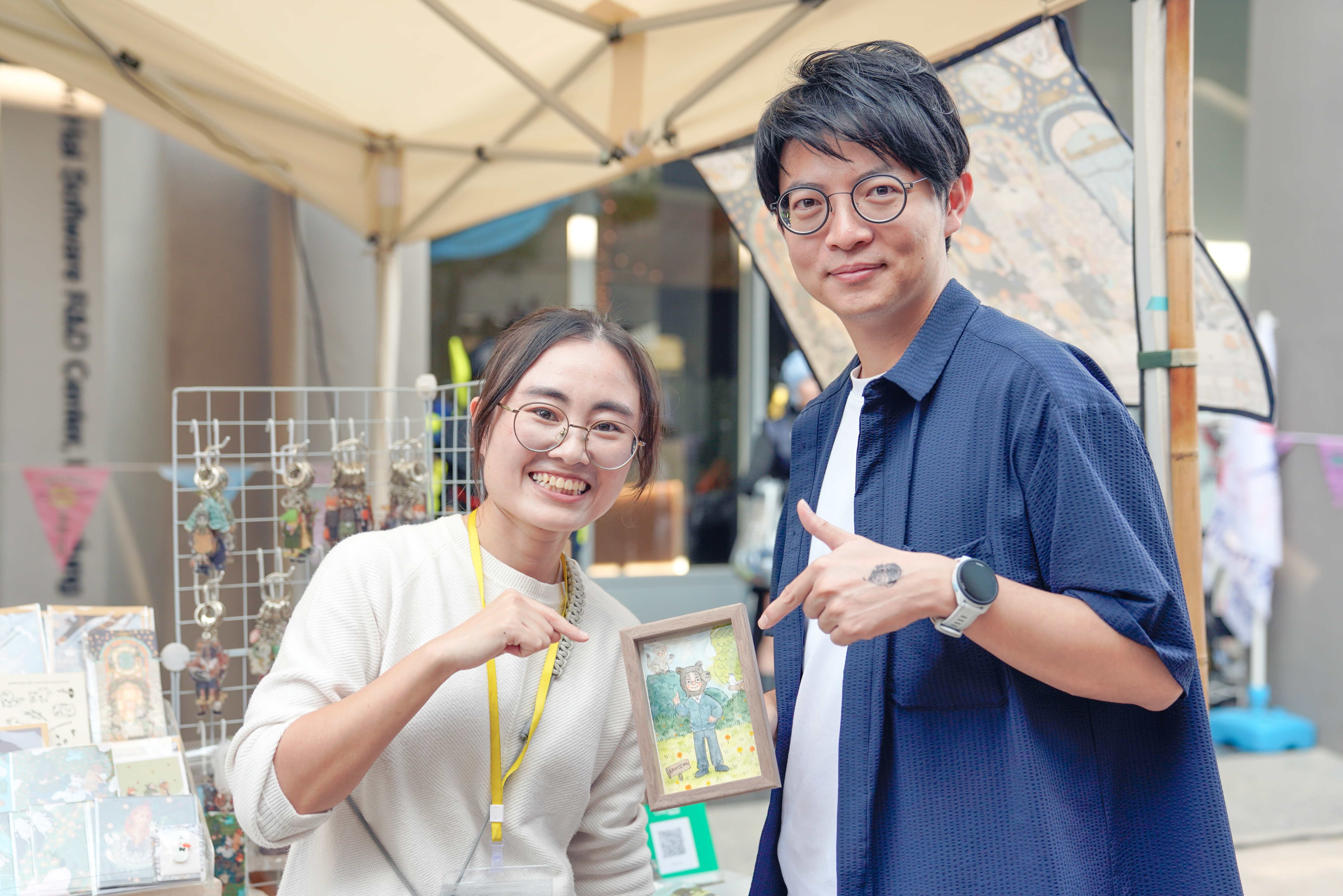 ↑圖說:本屆主視覺插畫由青創品牌「異想之森」設計,以自然與想像為靈感,以溫暖筆觸描繪動植物故事,展現療癒與永續的生活美學。(照片圖右為林楷軒局長,圖左為異想之森負責人王佳薇)(圖片來源:高雄市青年局提供)