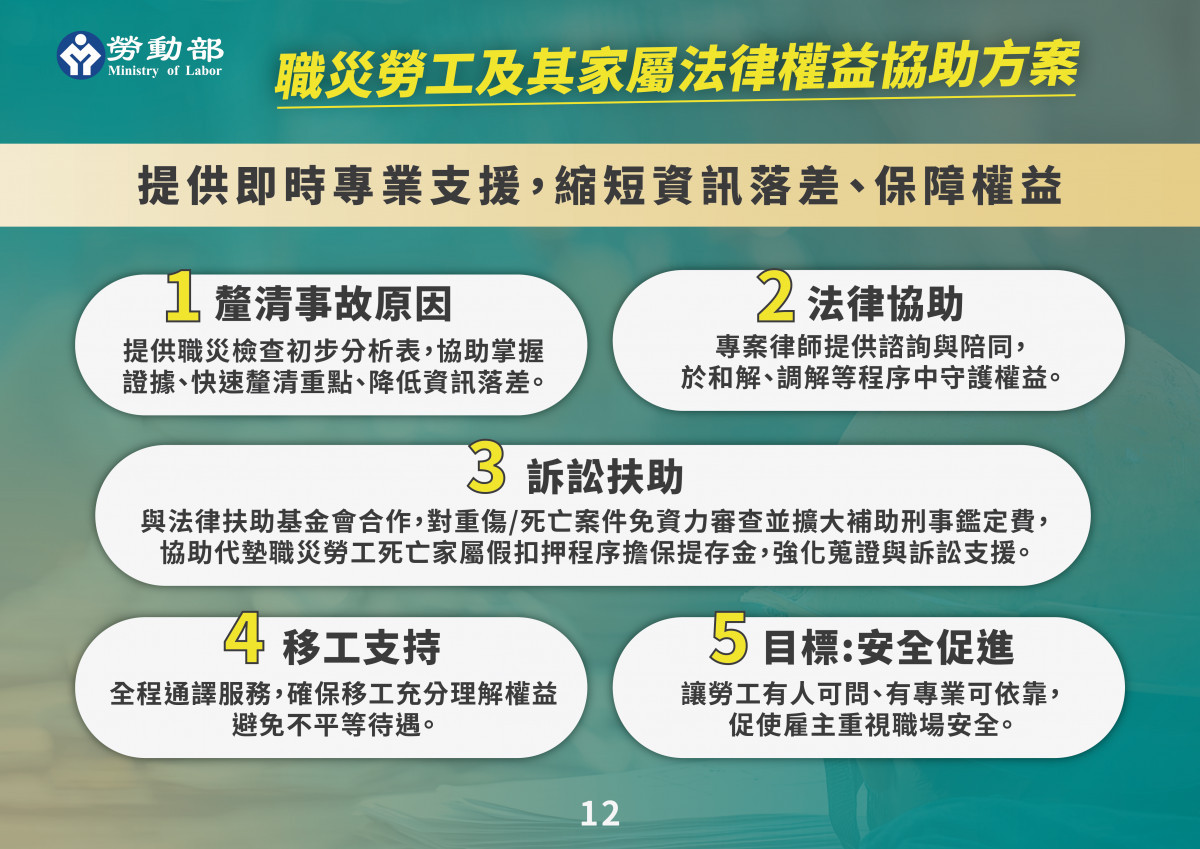 為協助勞工維護權益,勞動部將於115年推出「職災勞工及家屬法律權益協助方案」,從職災發生起,即提供全方位的法律支援,嘉義縣政府為保障職災勞工及其家屬的基本權益,減輕面對醫療、職災補償及法律程序時的焦慮與負擔,將與勞動部共同協助推動「職災勞工及家屬法律權益協助方案」,透過系統化、專業化的支持服務,幫助職災家庭在最艱難的時刻獲得及時且全面的協助。