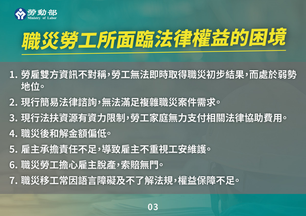 嘉義縣府勞青處指出,「職災勞工及家屬法律權益協助方案」從職災發生起,即提供全方位的法律支援,包括職災原因初步分析、專業律師諮詢、陪同和解與調解、以及訴訟扶助等,確保職災勞工及家屬能獲得應有的補償與賠償。同時,也促使雇主加強對職場安全衛生的重視。