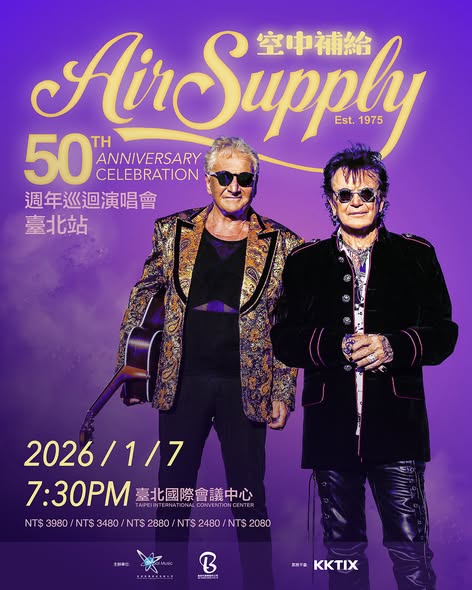 被譽為「西洋樂壇長青樹」的柔情搖滾經典傳奇樂團-空中補給合唱團(Air Supply)再添音樂生涯里程碑,適逢2025年成軍滿50周年,Air Supply同步啟動新專輯及全新巡演計畫,宣布將於明年1/7登上台北TICC舉行《空中補給50週年巡迴演唱會》臺北站的演出。