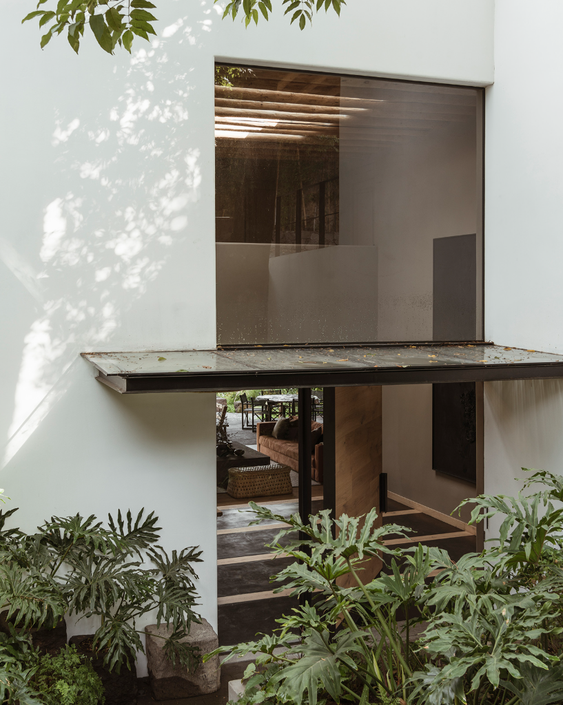 另一方面,進入住宅的路徑本身就是一場夢幻般的視覺饗宴,由位於街道層的停車場向下延伸出一條蜿蜒的樓梯帶領客人們繞過一棵美麗的樹木,周圍長滿綠色植物的石製花盆點綴著這條步道,最終抵達一座小庭院,而為了營造乾淨俐落的視覺效果,設計師將原有的浴室與傾斜的屋頂拆掉,並在入口處建造了一個新的花盆,其中種植了一系列天南星科植栽、丁香、藍蕨、山麥冬,以及達瓦利亞蕨,這些元素共同構成了主要室外門廊的設計,也在無形之中增添了盎然生機。