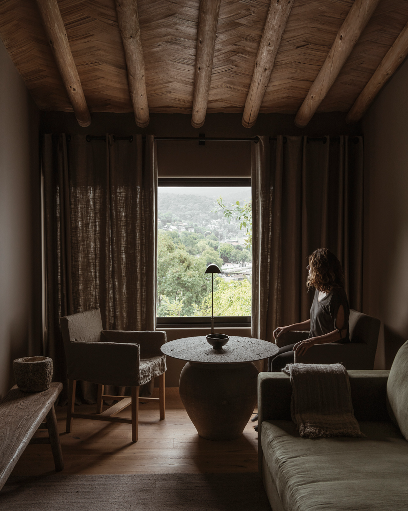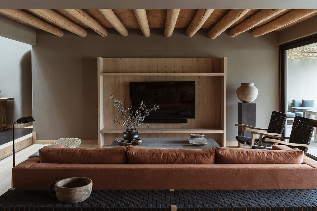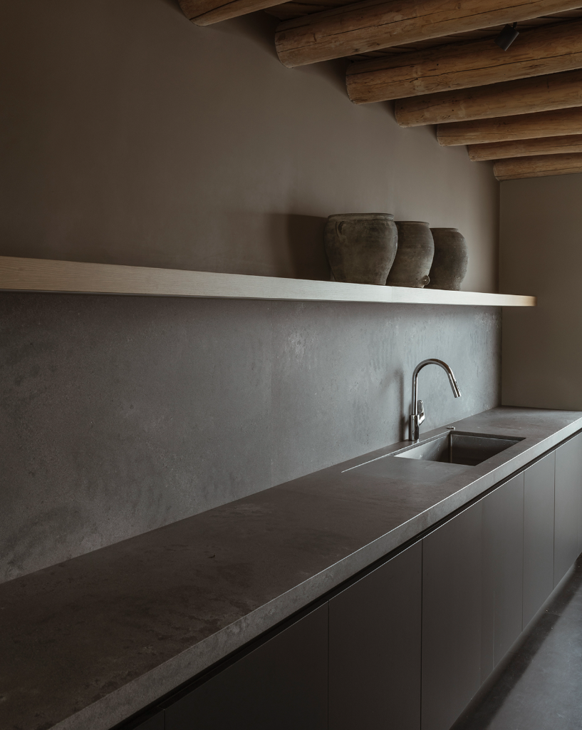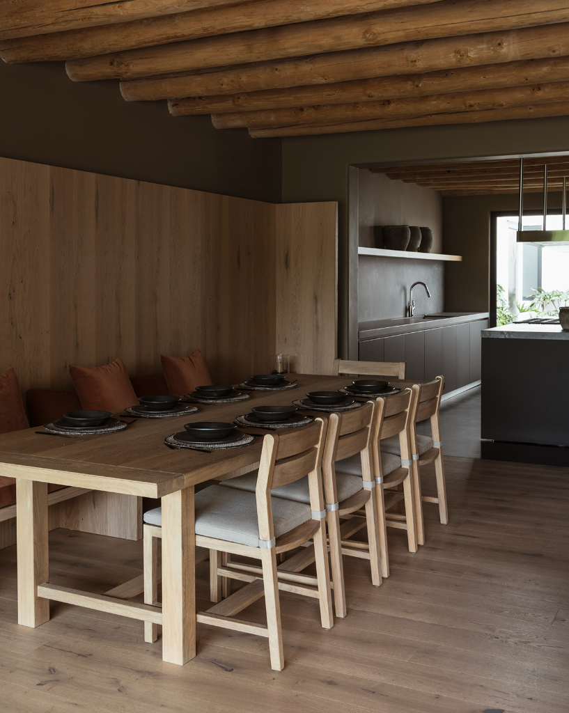值得一提的是,設計師針對本案所挑選的建材都給人非常溫暖的感覺,應屋主要求,特意將木製天花與屋頂瓦片給保留下來,地板則使用了貫穿整間房子的兩種元素:木材與黑色水泥,牆面包覆以石膏,再塗成淺棕色,表面平滑細膩的紋理與廚房及浴室選用的石材檯面形成巧妙呼應,並且隨著日光變化而呈現不同色調,進而豐富了空間表情。至於室內的家具、家飾也都經過精心挑選,或個別訂製,或來自經典品牌,當所有細節組合在一起,便創造出一個適合休息、冥想及與自己對話的環境,讓本案成為在繁忙的現代生活中,能夠找回內心平靜的終極避難所。