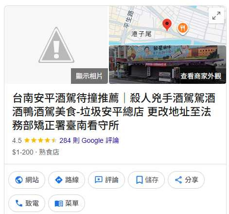 而鄭男犯行曝光後,遭起底是安平知名鹽酥鴨店老闆,店家Google評論被灌爆負評,一度僅剩1.4顆星,還被改名為「台南安平酒駕待撞推薦|殺人兇手酒駕駕酒酒鴨酒駕美食」;臉書粉絲專頁也緊急關閉。