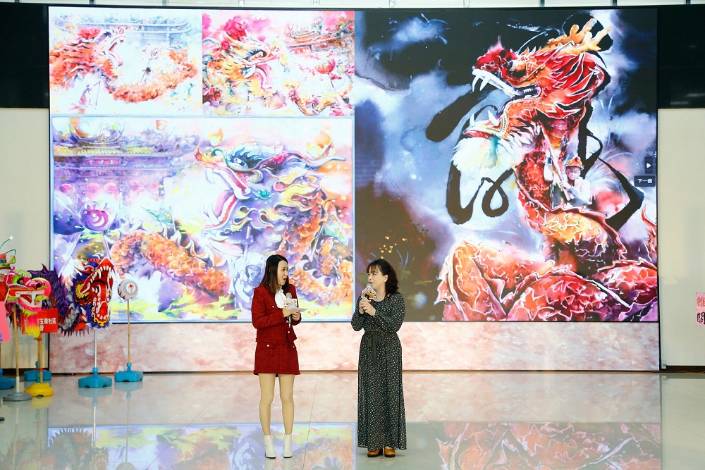 今年作品中的祥龍,是之前舞龍競技賽時拍攝的祥龍,丘璦珍一直希望將火旁龍舞動的動態畫出來,相當仔細觀察每個角度,希望同時呈現動作、方向、活靈活現表情,以及所有吉慶元素一次到位,苗栗火旁龍的熱鬧氛圍,躍然畫紙上。