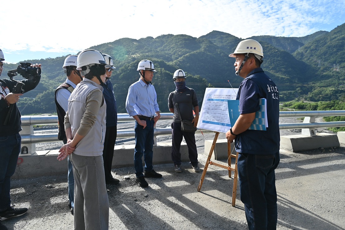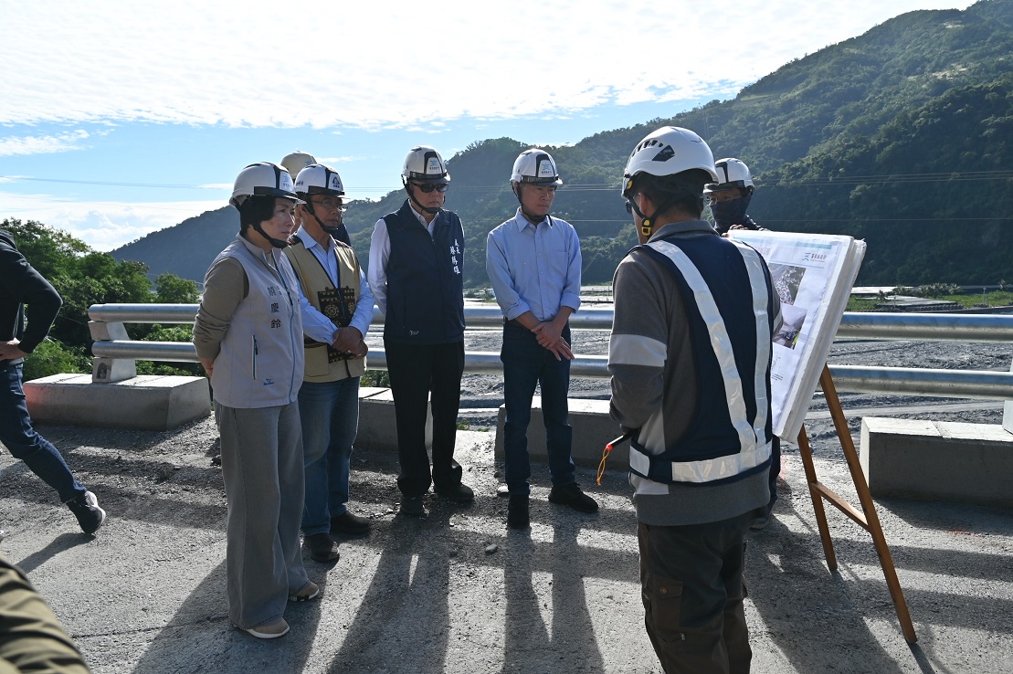 饒慶鈴上午在縣府建設處長蔡勝雄陪同下,與太麻里鄉長王重仁、金峰鄉長蔣爭光一同視察南迴災後搶修復建工程,第一站前往東64線鄉道3公里處,視察道路下邊坡堤防災害復建工程,建設處說明,為確保鄉民通行安全,採半半施工維持單線通行,目前道路下邊坡結構均已完成,半邊橋設計則施作上部結構,預定明年元月全部完工。