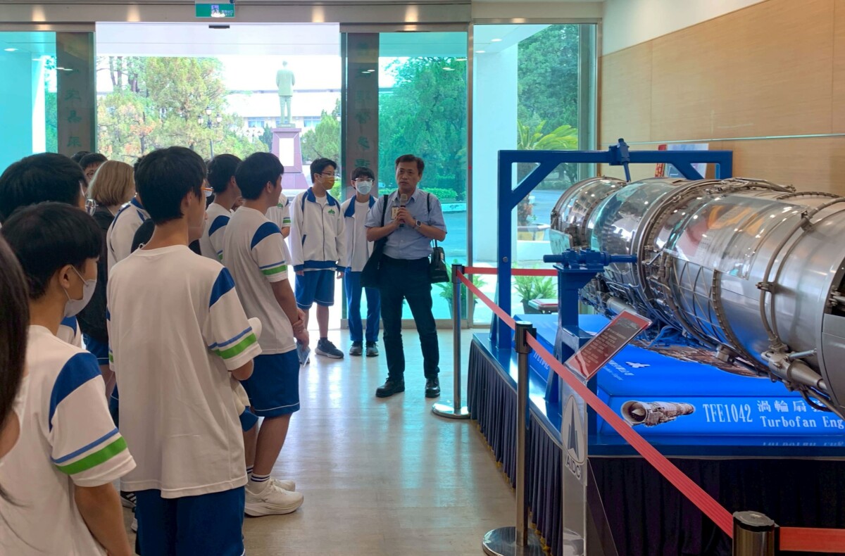 ▲漢翔航空工程師以 TFE1042 渦輪扇發動機為例,向學生講解機體核心構造,協助青年掌握航太產業在精密製造與系統整合上的專業要求。