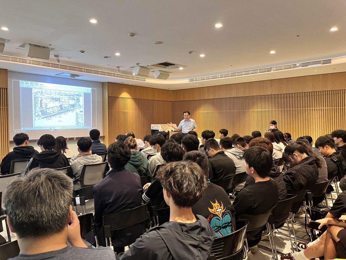 ▲高禾醫院以院區平面圖為例,向學生解說醫療建築設計所需要的空間規劃,例如機能分區、潔污動線、設備配置與通風系統等,協助學員理解醫療空間在安全與機能上的整體考量。