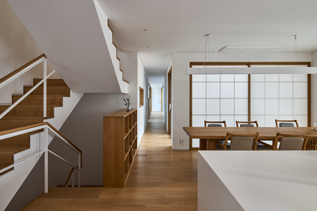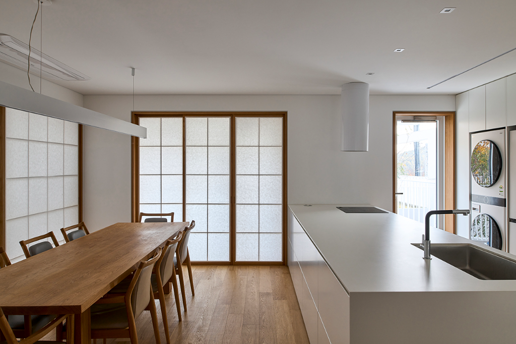 公領域部分,開放式廚房與開放式餐廳的組合,藉由大型中島與灰色檯面,搭配簡潔的櫥櫃,大幅提升實用機能,而通往各房間的入口則採用木製拉門與白色紙窗,既節省空間,也能透光,還保障了隱私,加上實木餐桌椅與精心挑選的燈具,整體給人一種極為溫馨舒適的生活氛圍。