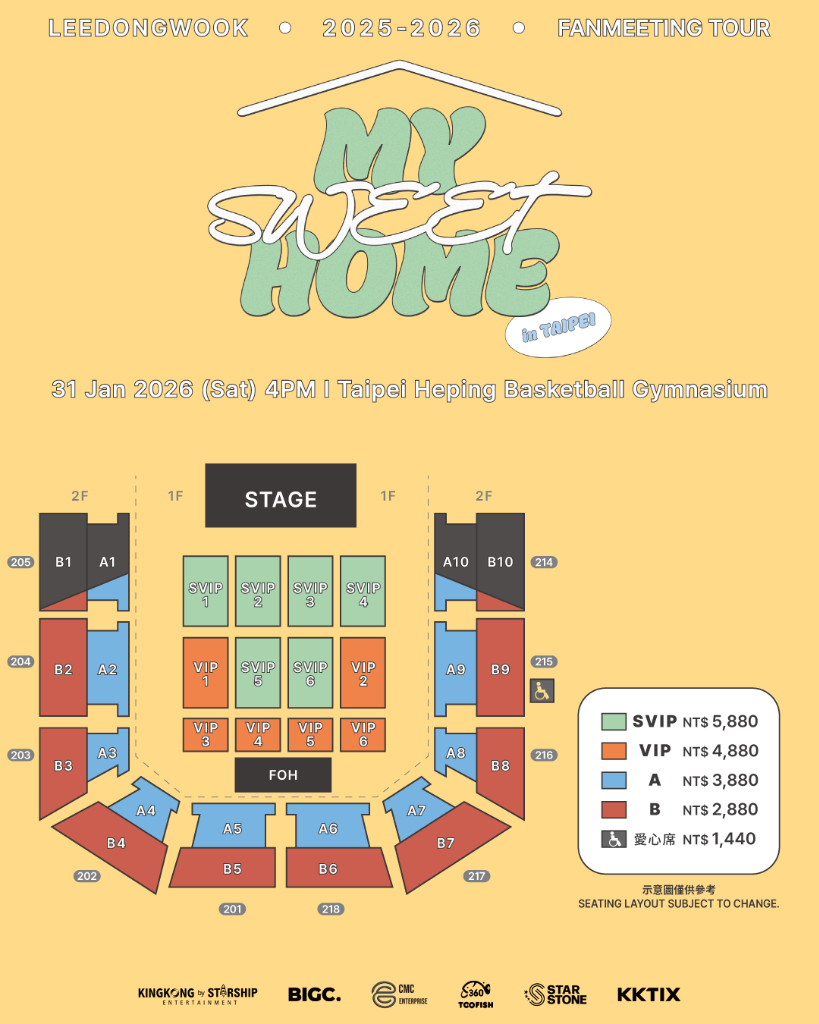 - 票價:SVIP區 $5,880 / VIP區 $4,880 / A區 $3,880 / B區 $2,880 / 愛心席 $1,440(全座席)