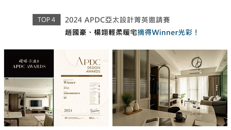 APDC亞太設計中心是室內設計聯合國組織IFI的全球成員,而由該組織發起的APDC AWARDS,是亞太地區最重要的獎項之一。帝特設計趙國豪、楊翊總監巧運溫潤和緩的大地色系,搭配曲弧流線及線板造型,描繪柔順輕盈的溫馨畫面,為深愛出國旅遊的業主二人,構築飽盈異國風韻的愜情屋邸《青苑遊》,於2024 APDC AWARDS中攫獲眾人目光,順利抱回「Winner」榮譽!