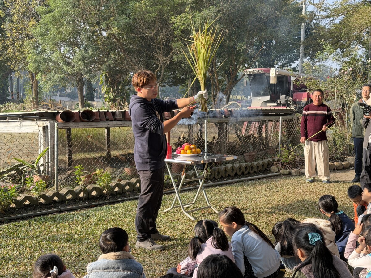活動開始進行謝天儀式,由校長與來賓帶領全校師生向天地致謝,展現對自然環境的尊重與感恩。隨後由丁威仁老師進行割稻示範與說明,師生實地下田體驗割稻,並在熱心農民提供收割機協助下,認識傳統農事與現代農業技術的結合,讓學習更貼近真實生活。