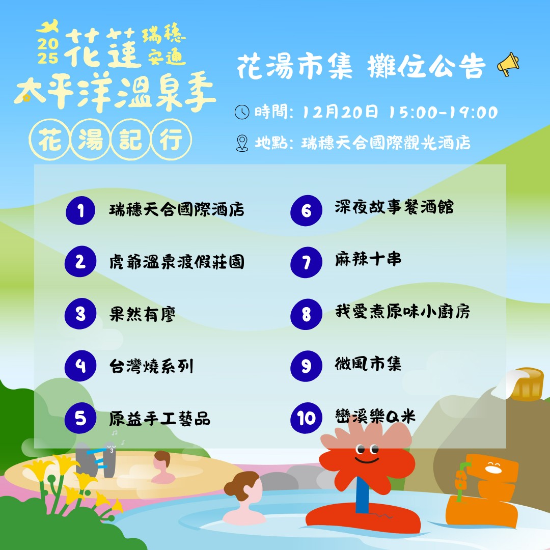 首度參與太平洋溫泉季,以充滿感染力的舞台魅力,為花蓮冬夜帶來最國際化、最熱鬧的壓軸演出。市集活動更安排有獎徵答,送出超人氣小石花抱枕、水瓶、牙刷旅行組等限量好禮,陪伴民眾在音樂與溫泉氛圍中度過暖心夜晚。觀光處長余明勲強調,花蓮縣政府感謝全國鏟子超人所推出的「鏟子超人泡湯券」,邀請全國民眾只要能出示任何可證明參與光復水災復原重建的照片或相關佐證,即可於12月20日晚間6點起在瑞穗天合國際觀光酒店的「花湯市集音樂會」服務台,或是至12月21日止每天下午5點到晚上10點在瑞穗溫泉公園的活動服務台兌換瑞穗、安通溫泉聯合泡湯券,讓默默付出的「英雄、美人與超人」都能獲得一份溫暖回饋。瑞穗溫泉公園泡腳池與燈飾裝置亦持續於每日17:00至22:00免費開放至12月21日(日)為止,誠摯邀請民眾把握溫泉季最後週末,白天騎旅、夜晚聽歌、泡湯暖身,一起在花蓮為今年畫下最溫暖的句點。