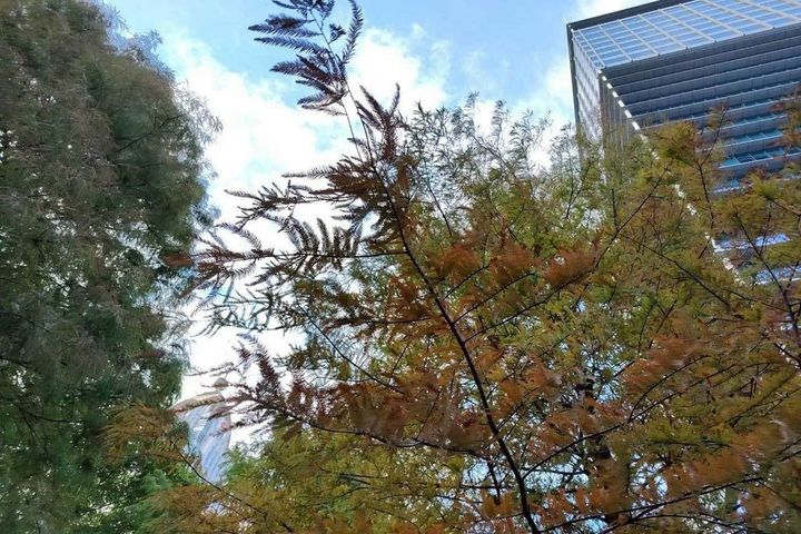 近日寒流來襲,天氣漸漸變冷,讓落羽松開始轉色。 圖:臺北市政府工務局/提供