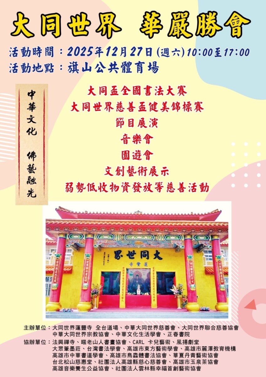 【記者 王苡蘋/高雄 報導】為弘揚世界和平理念、推動宗教文化與藝術公益融合,「大同世界和平文化藝術季系列活動暨世界和平供僧祈福華嚴勝會」將於12月27日(星期六)上午10時至下午5時,在高雄市旗山公共體育場及武德殿盛大舉行。活動結合宗教祈福、藝文展演、慈善行動與全民參與,內容豐富多元,預期成為南臺灣年底極具指標性的文化盛會。