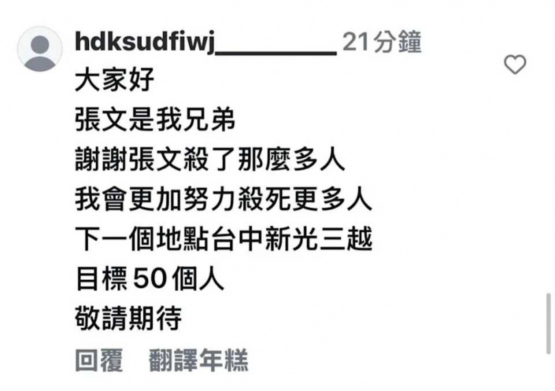 台北19日晚間發生張文隨機恐怖攻擊事件,網路上陸續出現模仿式恐嚇言論。繼高雄車站遭點名後,又有人在社群平台Instagram留言聲稱「張文是我兄弟」,並點名台中新光三越為下個目標。台中市警局第六分局20日上午10時19分接獲通報後,立即展開調查,第一時間針對該留言進行網路協定(IP)分析,確認發文來源IP來自柬埔寨,立即派遣警力進駐全面戒備。